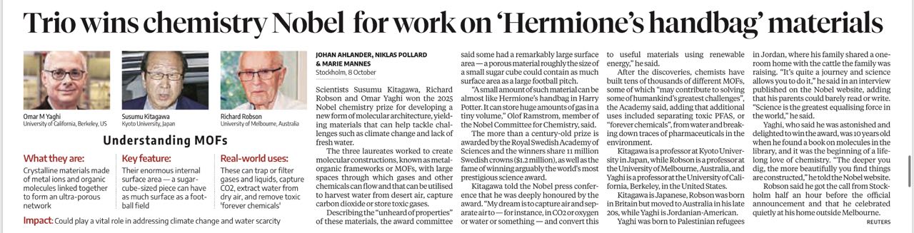Trio wins chemistry Noble for work on ‘Hermione’s handbag’ materials