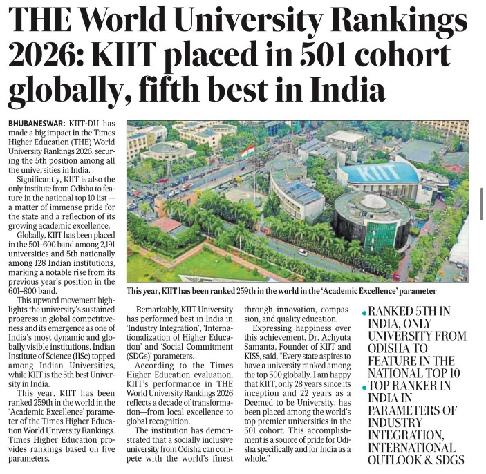 The world university Rankings 2026: KIIT placed in 501 cohort globally, fifty best in India