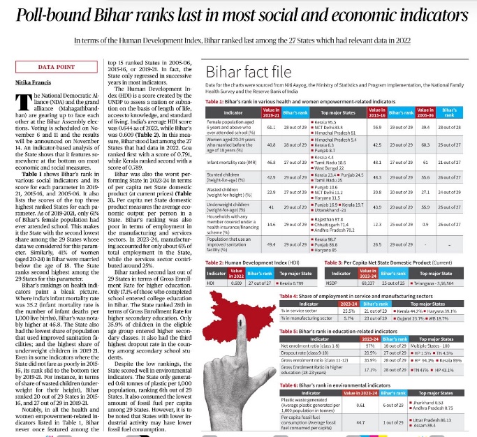 Poll-bound Bihar ranks last in most Social and economic indicators