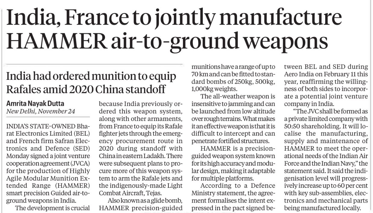 India, France to jointly manufacture HMMER air-to-ground weapons