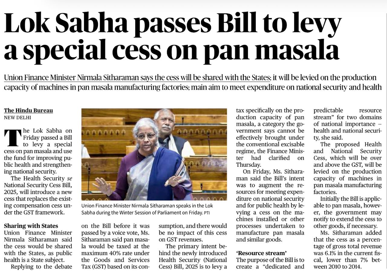 Lok Sabha passes Bill to levy a special cess on pan masala
