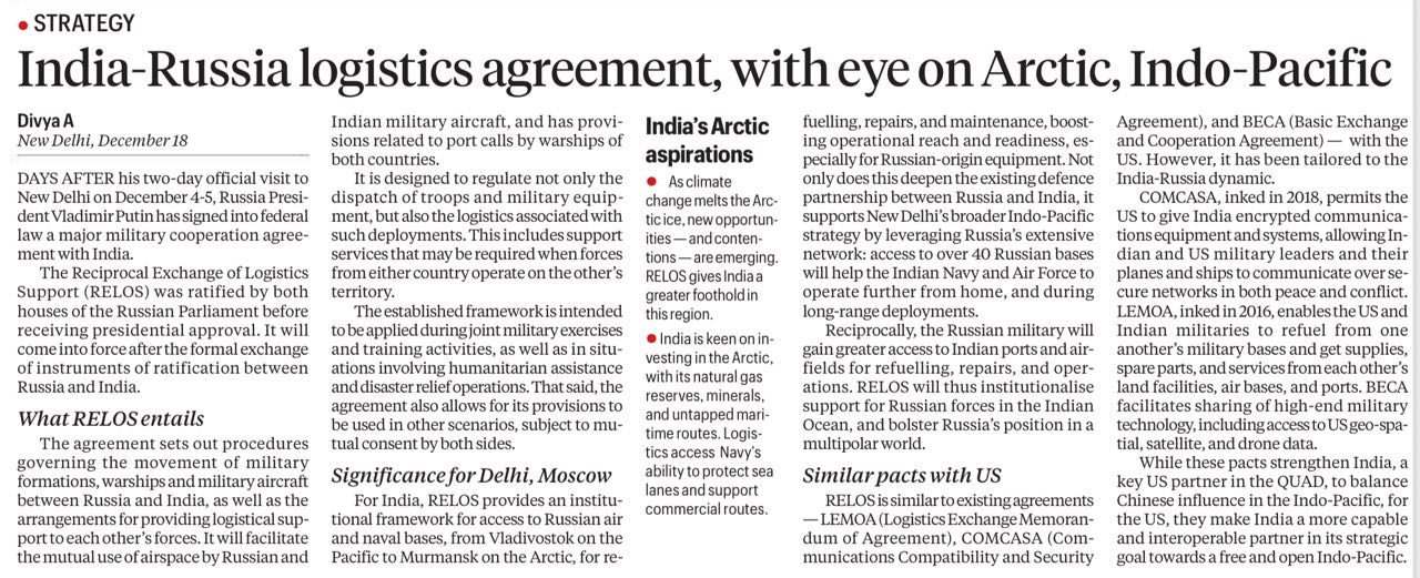 India-Russia logistics agreement, with eye on Arctic, Indi-Pacific