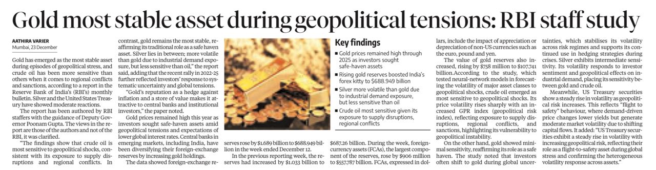 Gold most stable asset during geopolitical tensions: RBI staff study