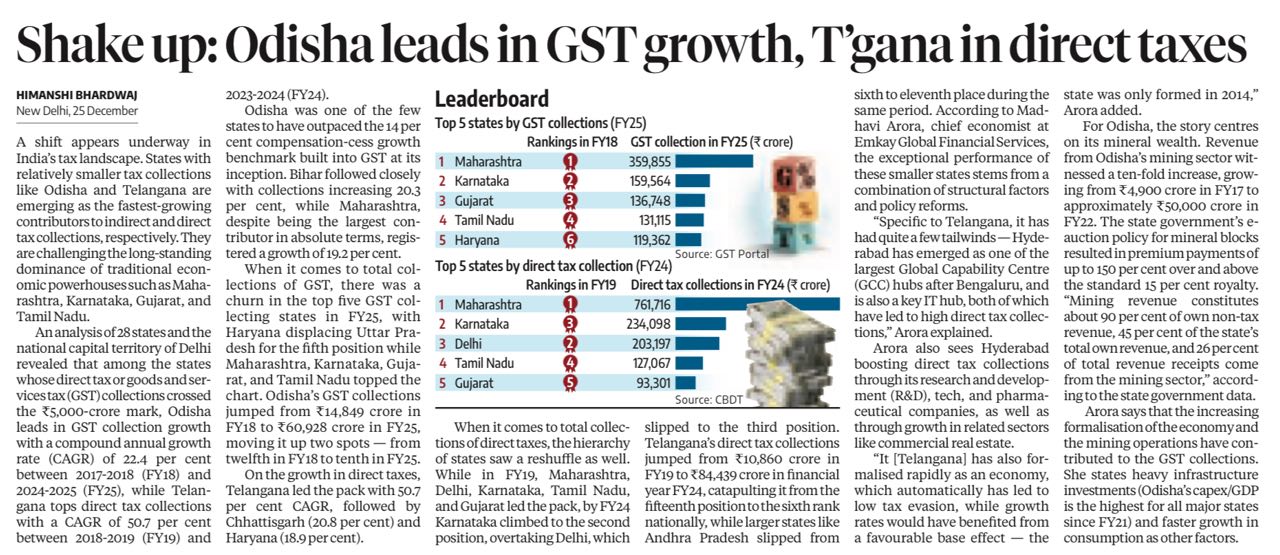 Shake up: Odisha leads in GST growth, T’gana in direct taxes