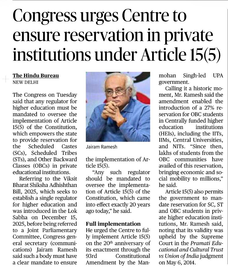 Congress urges Centre to ensure reservation in private institutions under Article 15(5)