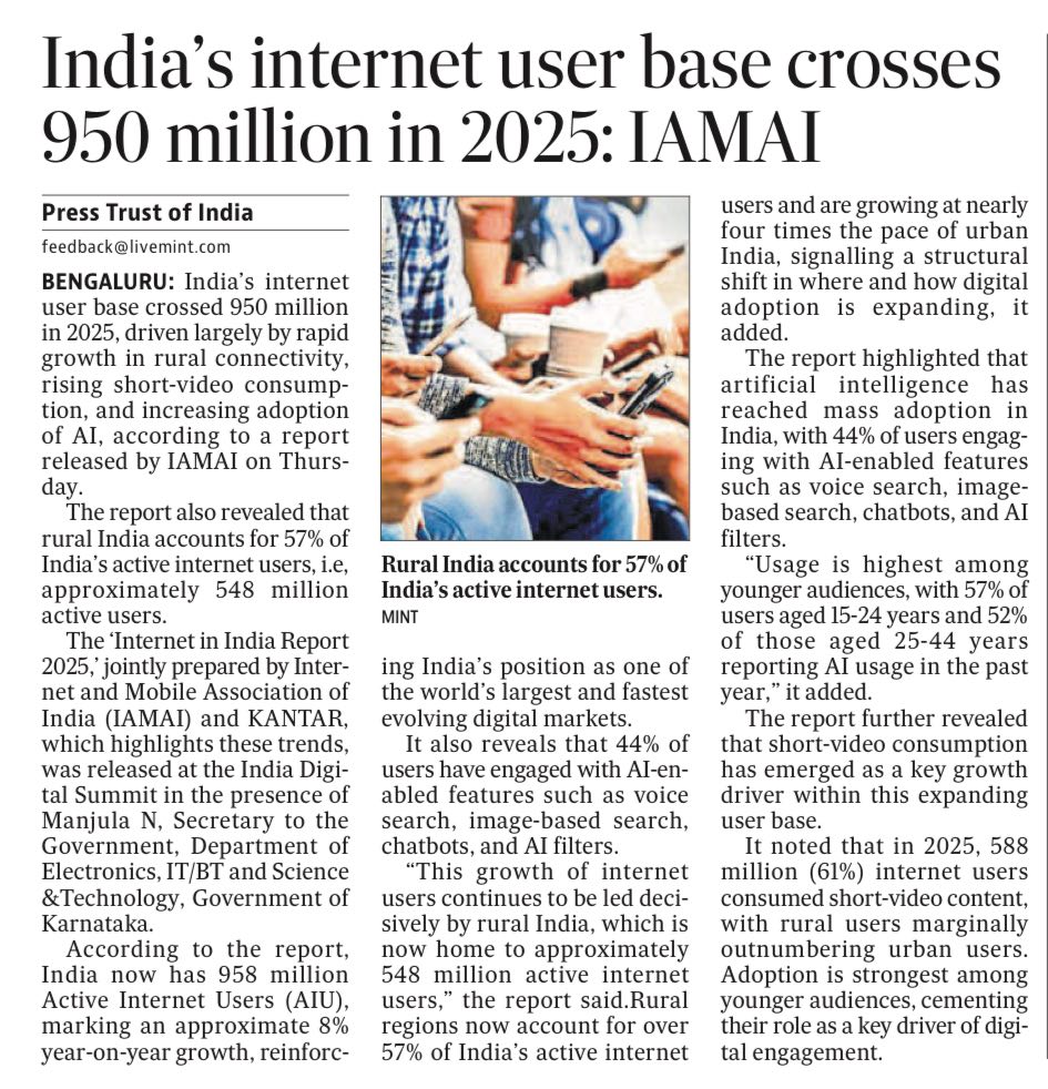 India’s internet user base crosses 950 million in 2025: IAMAI