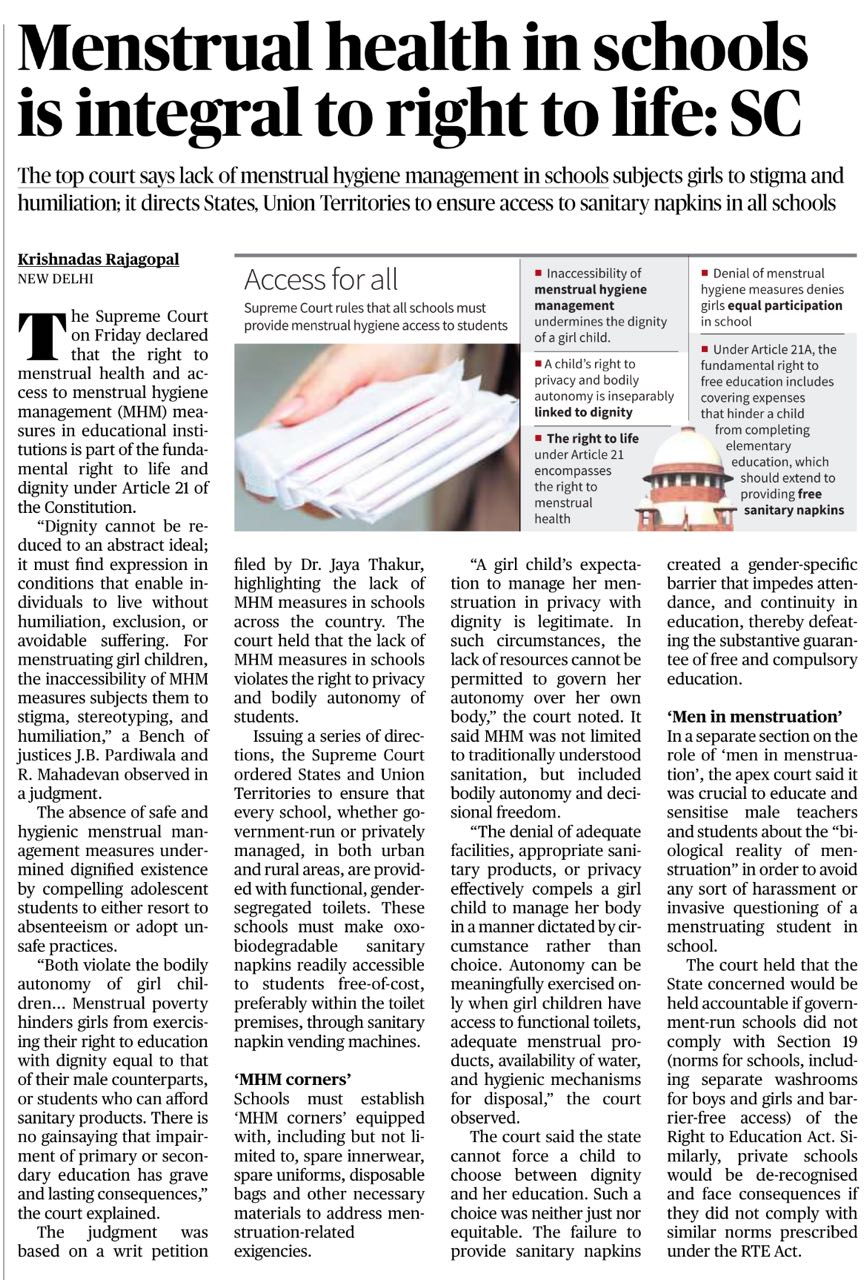Menstrual health in Schools is integral to rights to file: SC