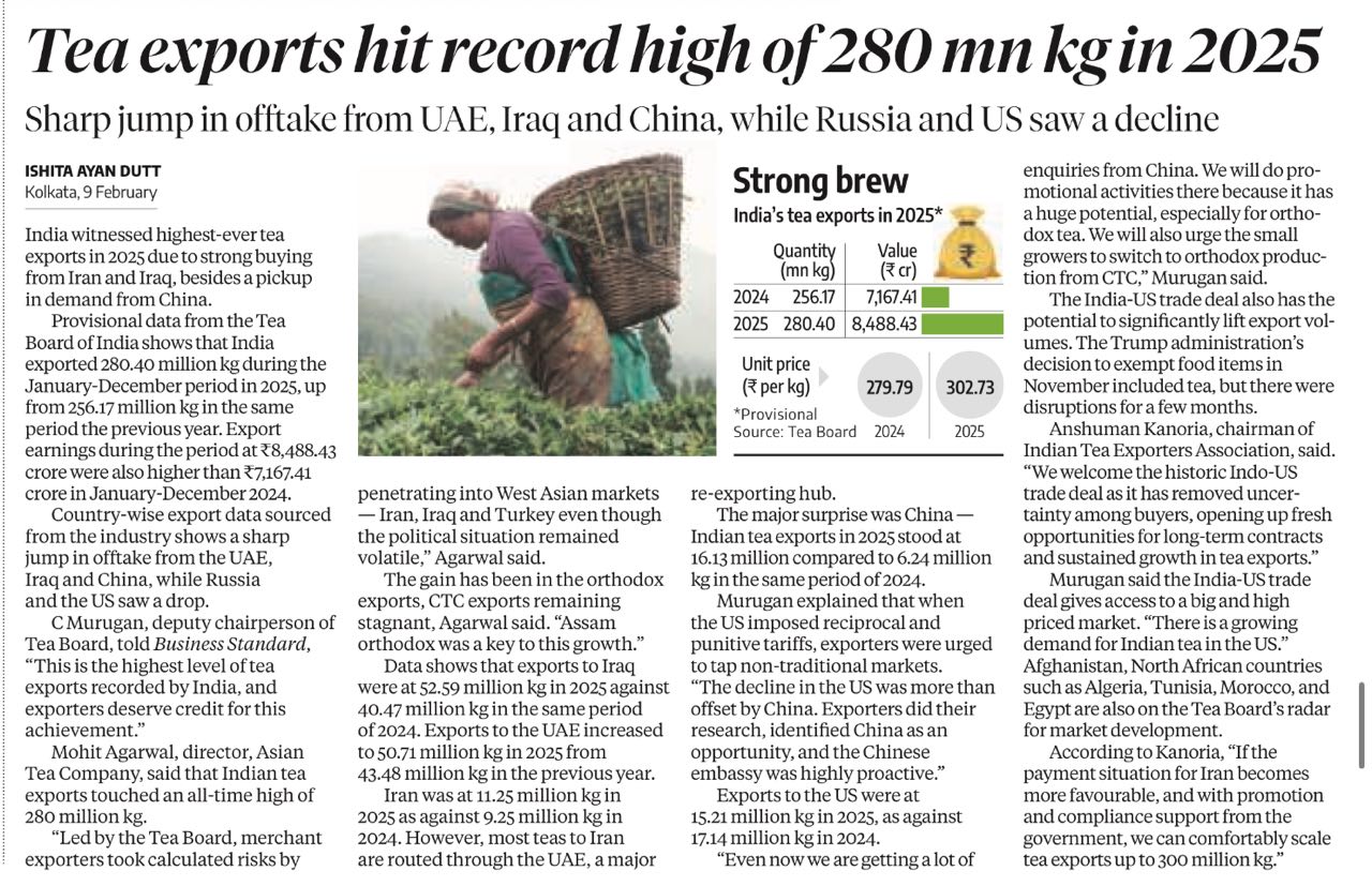 Tea exports hit record high of 280mn kg in 2025